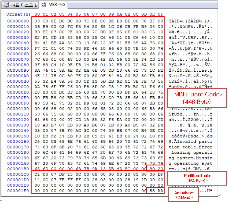 - 저장매체의 첫 번째 섹터에 위치하는 512Byte 크기의 영역
