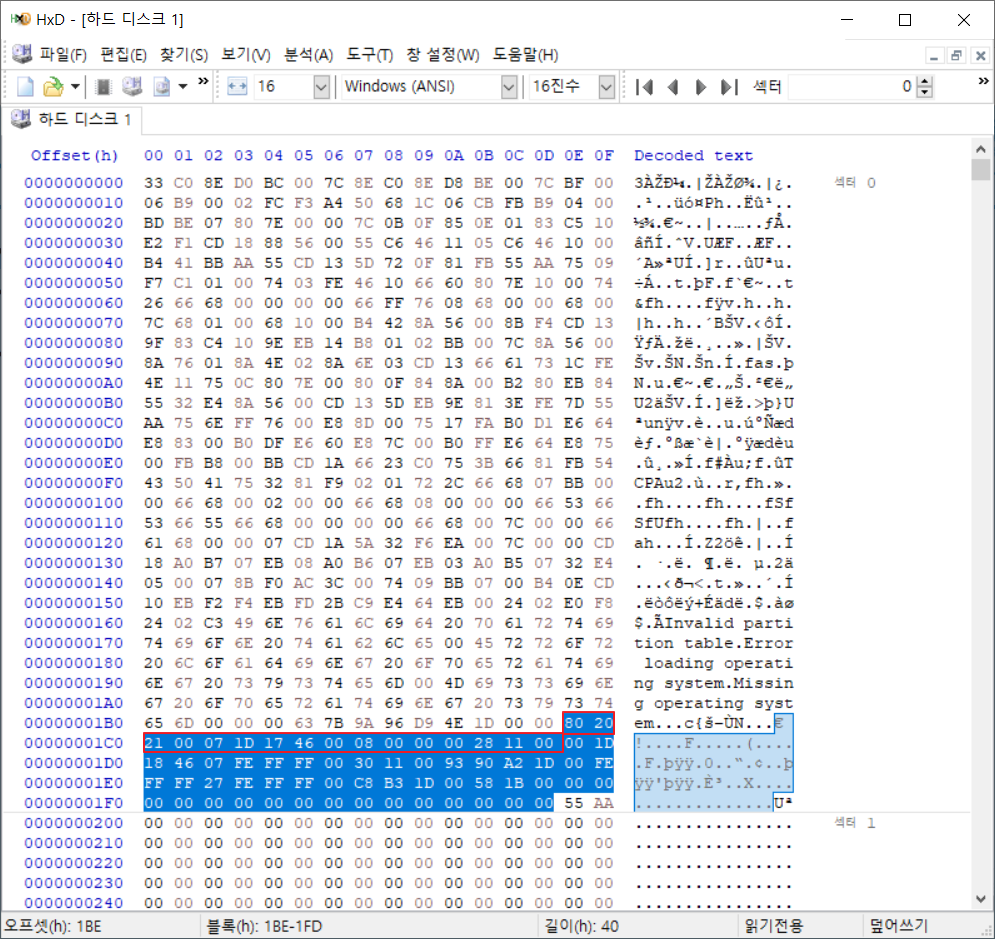 ex) 위의 그림에서 0x1BE위치 부터 16Byte