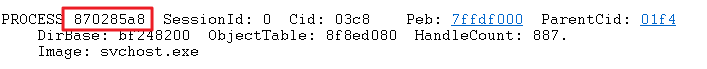 3. svchost 중 하나의 주소인 870285a8을 상세히 정보 분석한다.