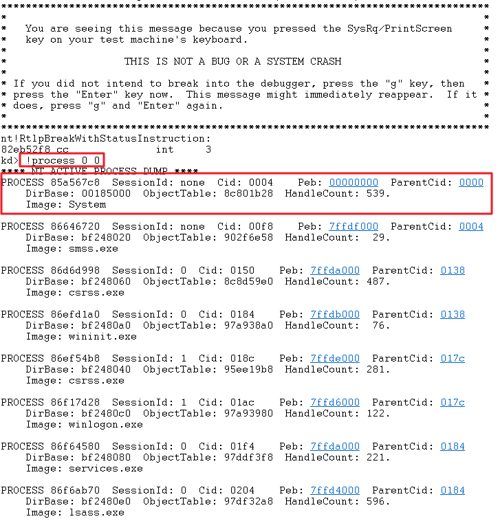 kd> !process -1 PROCESS 85a567c8 SessionId: none Cid: 0004 Peb: 00000000 ParentCid: 0000 DirBase: 00185000 ObjectTable: 8c801b28 HandleCount: 539. Image: System VadRoot 865119f0 Vads 9 Clone 0 Private 4. Modified 9379. Locked 64. DeviceMap 8c8088a8 Token 8c801248 ElapsedTime 00:07:00.802 UserTime 00:00:00.000 KernelTime 00:00:00.953 QuotaPoolUsage[PagedPool] 0 QuotaPoolUsage[NonPagedPool] 0 Working Set Sizes (now,min,max) (157, 0, 0) (628KB, 0KB, 0KB) PeakWorkingSetSize 1499 VirtualSize 2 Mb PeakVirtualSize 7 Mb PageFaultCount 13349 MemoryPriority BACKGROUND BasePriority 8 CommitCharge 12 THREAD 85a564f0 Cid 0004.0008 Teb: 00000000 Win32Thread: 00000000 WAIT: (WrFreePage) KernelMode Non-Alertable 82f863f0 Gate THREAD 85b0dd48 Cid 0004.000c Teb: 00000000 Win32Thread: 00000000 WAIT: (Executive) KernelMode Non-Alertable 82f7e5d0 SynchronizationEvent THREAD 85b0da70 Cid 0004.0010 Teb: 00000000 Win32Thread: 00000000 WAIT: (Executive) KernelMode Non-Alertable 82f7eac0 Semaphore Limit 0x7fffffff THREAD 85af1d48 Cid 0004.0014 Teb: 00000000 Win32Thread: 00000000 WAIT: (Executive) KernelMode Non-Alertable 82f7eac0 Semaphore Limit 0x7fffffff THREAD 85af17f0 Cid 0004.0018 Teb: 00000000 Win32Thread: 00000000 WAIT: (WrQueue) UserMode Non-Alertable 82f77480 QueueObject THREAD 85aedd48 Cid 0004.001c Teb: 00000000 Win32Thread: 00000000 WAIT: (WrQueue) UserMode Non-Alertable 82f77480 QueueObject THREAD 85aeda70 Cid 0004.0020 Teb: 00000000 Win32Thread: 00000000 WAIT: (WrQueue) UserMode Non-Alertable 82f77480 QueueObject THREAD 85ae1d48 Cid 0004.0024 Teb: 00000000 Win32Thread: 00000000 WAIT: (WrQueue) UserMode Non-Alertable 82f77480 QueueObject THREAD 85ae1a70 Cid 0004.0028 Teb: 00000000 Win32Thread: 00000000 WAIT: (WrQueue) UserMode Non-Alertable 82f77480 QueueObject THREAD 85acdd48 Cid 0004.002c Teb: 00000000 Win32Thread: 00000000 WAIT: (WrQueue) UserMode Non-Alertable 82f774bc QueueObject THREAD 85acda70 Cid 0004.0030 Teb: 00000000 Win32Thread: 00000000 WAIT: (WrQueue) UserMode Non-Alertable 82f774bc QueueObject THREAD 85afd858 Cid 0004.0034 Teb: 00000000 Win32Thread: 00000000 WAIT: (WrQueue) UserMode Non-Alertable 82f774bc QueueObject THREAD 85afd580 Cid 0004.0038 Teb: 00000000 Win32Thread: 00000000 WAIT: (WrQueue) UserMode Non-Alertable 82f774bc QueueObject THREAD 85ae5960 Cid 0004.003c Teb: 00000000 Win32Thread: 00000000 WAIT: (WrQueue) UserMode Non-Alertable 82f774bc QueueObject THREAD 85ae5688 Cid 0004.0040 Teb: 00000000 Win32Thread: 00000000 WAIT: (WrQueue) UserMode Non-Alertable 82f774bc QueueObject THREAD 85ae53b0 Cid 0004.0044 Teb: 00000000 Win32Thread: 00000000 WAIT: (WrQueue) UserMode Non-Alertable 82f774bc QueueObject THREAD 85ac9d48 Cid 0004.0048 Teb: 00000000 Win32Thread: 00000000 WAIT: (WrQueue) KernelMode Non-Alertable 82f774f8 QueueObject THREAD 85ac9a70 Cid 0004.004c Teb: 00000000 Win32Thread: 00000000 WAIT: (Executive) KernelMode Non-Alertable 8e103c28 NotificationTimer 82f77460 SynchronizationEvent 82f77450 SynchronizationEvent THREAD 85b09020 Cid 0004.0050 Teb: 00000000 Win32Thread: 00000000 WAIT: (Suspended) KernelMode Non-Alertable 82f68740 Gate THREAD 85b09730 Cid 0004.0054 Teb: 00000000 Win32Thread: 00000000 WAIT: (WrVirtualMemory) UserMode Non-Alertable 82f861e0 Semaphore Limit 0x7fffffff 82f86260 NotificationEvent 82f862f0 NotificationEvent 82f85c60 NotificationEvent 82f85c80 SynchronizationEvent THREAD 85b09390 Cid 0004.0058 Teb: 00000000 Win32Thread: 00000000 WAIT: (WrFreePage) KernelMode Non-Alertable 82f85390 Gate THREAD 85b13d48 Cid 0004.005c Teb: 00000000 Win32Thread: 00000000 WAIT: (Executive) KernelMode Non-Alertable 8e113bf0 SynchronizationEvent 82f85d90 SynchronizationEvent THREAD 85b13a70 Cid 0004.0060 Teb: 00000000 Win32Thread: 00000000 WAIT: (Executive) KernelMode Non-Alertable 82fa1090 SynchronizationEvent THREAD 85b0fc80 Cid 0004.0068 Teb: 00000000 Win32Thread: 00000000 WAIT: (WrFreePage) KernelMode Non-Alertable 82fa5100 SynchronizationEvent 82fa50f0 SynchronizationEvent 82fa50e0 SynchronizationEvent 82fa50d0 SynchronizationEvent THREAD 85b0c788 Cid 0004.006c Teb: 00000000 Win32Thread: 00000000 WAIT: (WrQueue) KernelMode Non-Alertable 82fa41a0 QueueObject THREAD 85b0c4b0 Cid 0004.0070 Teb: 00000000 Win32Thread: 00000000 WAIT: (WrQueue) KernelMode Non-Alertable 82fa41c8 QueueObject THREAD 85b0b660 Cid 0004.0074 Teb: 00000000 Win32Thread: 00000000 WAIT: (WrLpcReceive) UserMode Non-Alertable 85b0b894 Semaphore Limit 0x1 THREAD 85abebf8 Cid 0004.007c Teb: 00000000 Win32Thread: 00000000 WAIT: (WrFreePage) KernelMode Non-Alertable 82f85ee0 SynchronizationEvent 82f85ef0 SynchronizationEvent 82f85f00 SynchronizationEvent 82f85f10 SynchronizationEvent 82f85f20 SynchronizationEvent 82f85f30 SynchronizationEvent 82f85f40 SynchronizationEvent 82f85f50 SynchronizationEvent 82f85f60 SynchronizationEvent 82f85f70 SynchronizationEvent 82f85f80 SynchronizationEvent 82f85f90 SynchronizationEvent 82f85fa0 SynchronizationEvent 82f85fb0 SynchronizationEvent 82f85fc0 SynchronizationEvent 82f85fd0 SynchronizationEvent 82f85fe0 SynchronizationEvent THREAD 85ac0308 Cid 0004.0080 Teb: 00000000 Win32Thread: 00000000 WAIT: (Executive) KernelMode Non-Alertable 85ac075c SynchronizationEvent 85ac0770 SynchronizationTimer THREAD 85b10d48 Cid 0004.0084 Teb: 00000000 Win32Thread: 00000000 WAIT: (Executive) KernelMode Non-Alertable 85b1019c SynchronizationEvent 85b101b0 SynchronizationTimer THREAD 85b67020 Cid 0004.0088 Teb: 00000000 Win32Thread: 00000000 WAIT: (Executive) KernelMode Non-Alertable 85b465dc SynchronizationEvent 85b465f0 SynchronizationTimer THREAD 85b67d48 Cid 0004.008c Teb: 00000000 Win32Thread: 00000000 WAIT: (Executive) KernelMode Non-Alertable 85b4631c SynchronizationEvent 85b46330 SynchronizationTimer THREAD 85b92d48 Cid 0004.0090 Teb: 00000000 Win32Thread: 00000000 WAIT: (Executive) KernelMode Non-Alertable 85b8fedc SynchronizationEvent 85b8fef0 SynchronizationTimer THREAD 85b9c020 Cid 0004.0094 Teb: 00000000 Win32Thread: 00000000 WAIT: (Executive) KernelMode Non-Alertable 8