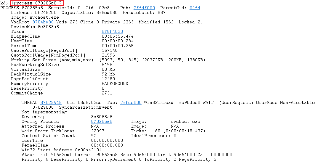 kd> !process 870285a8 7 PROCESS 870285a8 SessionId: 0 Cid: 03c8 Peb: 7ffdf000 ParentCid: 01f4 DirBase: bf248200 ObjectTable: 8f8ed080 HandleCount: 887. Image: svchost.exe VadRoot 8704be80 Vads 273 Clone 0 Private 2363. Modified 1562. Locked 2. DeviceMap 8c8088a8 Token 8f8f4030 ElapsedTime 00:06:56.474 UserTime 00:00:00.234 KernelTime 00:00:00.265 QuotaPoolUsage[PagedPool] 167140 QuotaPoolUsage[NonPagedPool] 21596 Working Set Sizes (now,min,max) (5093, 50, 345) (20372KB, 200KB, 1380KB) PeakWorkingSetSize 5198 VirtualSize 88 Mb PeakVirtualSize 92 Mb PageFaultCount 12489 MemoryPriority BACKGROUND BasePriority 8 CommitCharge 2731 THREAD 87025918 Cid 03c8.03cc Teb: 7ffde000 Win32Thread: fe9bdbe0 WAIT: (UserRequest) UserMode Non-Alertable 87029030 SynchronizationEvent Not impersonating DeviceMap 8c8088a8 Owning Process 870285a8 Image: svchost.exe Attached Process N/A Image: N/A Wait Start TickCount 22097 Ticks: 1180 (0:00:00:18.437) Context Switch Count 97 IdealProcessor: 0 UserTime 00:00:00.000 KernelTime 00:00:00.000 Win32 Start Address 0x00a42104 Stack Init 90663ed0 Current 90663ac8 Base 90664000 Limit 90661000 Call 00000000 Priority 9 BasePriority 8 PriorityDecrement 0 IoPriority 2 PagePriority 5 ChildEBP RetAddr Args to Child 90663ae0 82eb887d 87025918 82f6a008 82f66e20 nt!KiSwapContext+0x26 (FPO: [Uses EBP] [0,0,4]) 90663b18 82eb76db 870259d8 87025918 87029030 nt!KiSwapThread+0x266 90663b40 82eb0f6f 87025918 870259d8 00000000 nt!KiCommitThreadWait+0x1df 90663bb8 83066532 87029030 00000006 00010001 nt!KeWaitForSingleObject+0x393 90663c20 82e77a06 000000b4 00000000 00000000 nt!NtWaitForSingleObject+0xc6 90663c20 771370d4 000000b4 00000000 00000000 nt!KiSystemServicePostCall (FPO: [0,3] TrapFrame @ 90663c34) 0013fd20 00000000 00000000 00000000 00000000 ntdll!KiFastSystemCallRet (FPO: [0,0,0]) THREAD 8702a030 Cid 03c8.03d0 Teb: 7ffdd000 Win32Thread: 00000000 WAIT: (UserRequest) UserMode Alertable 87024280 SynchronizationTimer 87024348 SynchronizationTimer 87050970 SynchronizationEvent 8705c318 SynchronizationEvent 86f17d28 ProcessObject 86f29b10 SynchronizationEvent 85adc998 SynchronizationEvent 870b3a00 SynchronizationEvent 869e79a8 SynchronizationEvent 85a54a00 SynchronizationEvent 85daa930 SynchronizationEvent 870ae5f8 SynchronizationEvent 86a168b8 SynchronizationEvent 86f973e8 SynchronizationEvent 86a250e0 SynchronizationEvent 86a27650 SynchronizationEvent 86a47d48 SynchronizationEvent 86a50668 SynchronizationEvent 86a55c60 SynchronizationEvent 86f42468 SynchronizationEvent 85abf098 SynchronizationEvent 85abe608 SynchronizationEvent 85b2c318 SynchronizationEvent 86a7e6e8 SynchronizationEvent 85b2fe78 SynchronizationEvent 86a79b28 SynchronizationEvent 85abe700 SynchronizationEvent 86a7a748 SynchronizationEvent 86a7a678 SynchronizationEvent 86a80800 SynchronizationEvent 86a87cd0 SynchronizationEvent 86a73210 SynchronizationEvent 86f00d60 SynchronizationEvent 8733d820 SynchronizationEvent 87320368 SynchronizationEvent 872ca9e0 SynchronizationTimer 8735ab40 NotificationEvent 8735a788 NotificationEvent 8734e710 SynchronizationEvent 86a59620 SynchronizationEvent 86a20b50 SynchronizationEvent 8735ad48 SynchronizationEvent 8735a680 SynchronizationEvent 87350030 SynchronizationEvent 87350ff0 SynchronizationEvent 87350fb0 SynchronizationEvent 873501e8 SynchronizationEvent 8735de38 SynchronizationEvent 8735aeb8 SynchronizationEvent 87350908 SynchronizationEvent 8734cf70 SynchronizationEvent 85abf030 SynchronizationEvent 8734cc20 SynchronizationEvent 8731f130 SynchronizationEvent 8734c7d8 SynchronizationEvent 8734b480 SynchronizationEvent 8735d790 SynchronizationEvent 85b2d1a8 SynchronizationEvent 8734cdc8 SynchronizationEvent 8734c8b0 SynchronizationEvent 8733eb28 SynchronizationEvent 8733eb78 SynchronizationEvent 87024168 SynchronizationTimer 872c9878 SynchronizationTimer Not impersonating DeviceMap 8c8088a8 Owning Process 870285a8 Image: svchost.exe Attached Process N/A Image: N/A Wait Start TickCount 22126 Ticks: 1151 (0:00:00:17.984) Context Switch Count 258 IdealProcessor: 0 UserTime 00:00:00.000 KernelTime 00:00:00.000 Win32 Start Address ntdll!TppWaiterpThread (0x7711fcf7) Stack Init 9066fed0 Current 9066f648 Base 90670000 Limit 9066d000 Call 00000000 Priority 8 BasePriority 8 PriorityDecrement 0 IoPriority 2 PagePriority 5 ChildEBP RetAddr Args to Child 9066f660 82eb887d 8702a030 82f6a008 82f66e20 nt!KiSwapContext+0x26 (FPO: [Uses EBP] [0,0,4]) 9066f698 82eb76db 872c9878 8702a030 8735a65c nt!KiSwapThread+0x266 9066f6c0 82eb34b4 8702a030 8735a050 00000000 nt!KiCommitThreadWait+0x1df 9066f83c 8306711b 00000040 9066f974 00000001 nt!KeWaitForMultipleObjects+0x535 9066fac8 83066e88 00000040 9066fbf4 00000001 nt!ObpWaitForMultipleObjects+0x262 9066fc18 82e77a06 00000040 001fa838 00000001 nt!NtWaitForMultipleObjects+0xcd 9066fc18 771370d4 00000040 001fa838 00000001 nt!KiSystemServicePostCall (FPO: [0,3] TrapFrame @ 9066fc34) 0041fe94 00000000 00000000 00000000 00000000 ntdll!KiFastSystemCallRet (FPO: [0,0,0]) THREAD 87029340 Cid 03c8.03dc Teb: 7ffda000 Win32Thread: 00000000 WAIT: (DelayExecution) UserMode Alertable 87029574 Semaphore Limit 0x1 Impersonation token: 8f8f7030 (Level Delegation) Owning Process 870285a8 Image: svchost.exe Attached Process N/A Image: N/A Wait Start TickCount 22895 Ticks: 382 (0:00:00:05.968) Context Switch Count 1209 IdealProcessor: 0 UserTime 00:00:00.000 KernelTime 00:00:00.000 Win32 Start Address sechost!ScSvcctrlThreadW (0x759a7587) Stack Init 9067bed0 Current 9067bb08 Base 9067c000 Limit 90679000 Call 00000000 Priority 27 BasePriority 8 PriorityDecrement 0 IoPriority 2 PagePriority 5 ChildEBP RetAddr Args to Child 9067bb20 82eb887d 87029340 00000000 82f66e20 nt!KiSwapContext+0x26 (FPO: [Uses EBP] [0,0,4]) 9067bb58 82eb76db 00000000 87029340 80000000 nt!KiSwapThread+0x266 9067bb80 82eb73b9 87029340 87029400 000000ce nt!KiCommitThreadWait+0x1df 9067bbd8 83067382 0097f701 00000001 9067bbfc nt!KeDelayExecutionThread+0x2aa 9067bc24 82e77a06 00000001 73a81a90 0097fa64 nt